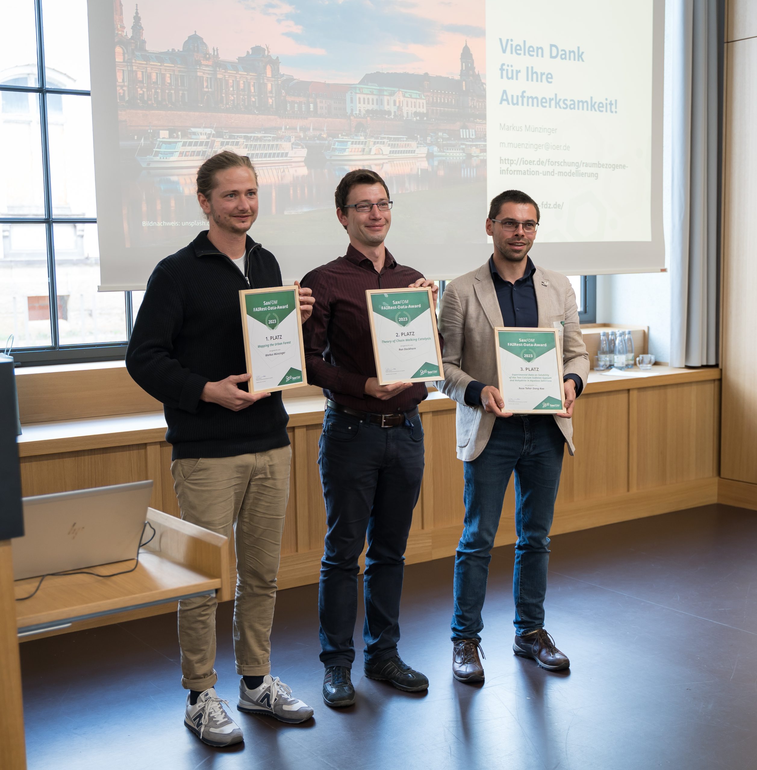 SaxFDM hat 2023 zum ersten Mal feierlich im Rahmen der Jahrestagung in Chemnitz den FAIRest-Data-Award vergeben. Es waren Einreichungen möglich, die an einer sächsischen Forschungs- oder Kultureinrichtung entstanden sind und für welche die einreichende Person als Angehörige:r der Einrichtung mitverantwortlich zeichnet. Dabei kamen Datensätze in Frage, die zum Zeitpunkt der Teilnahme frei zugänglich und nicht älter als fünf Jahre waren.