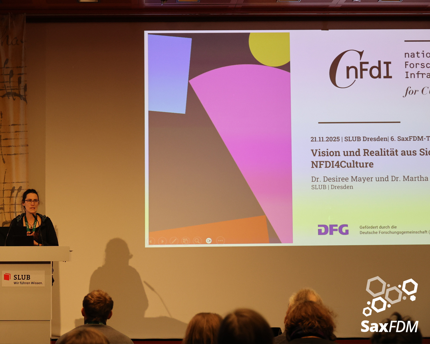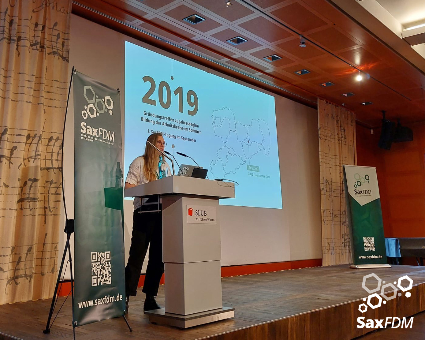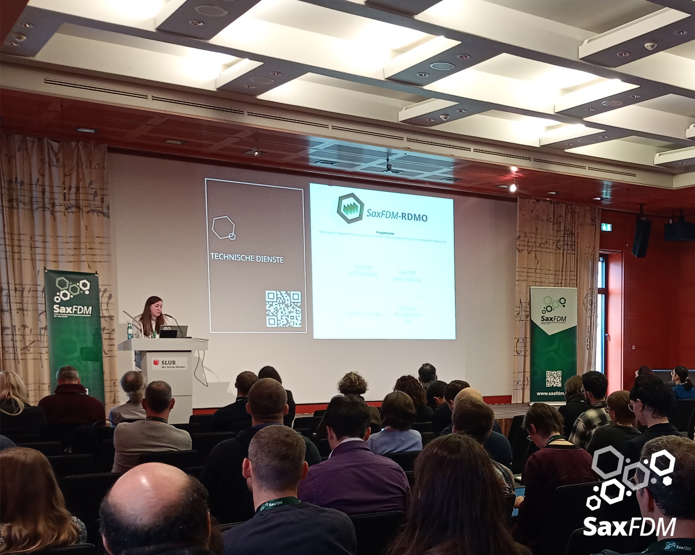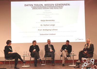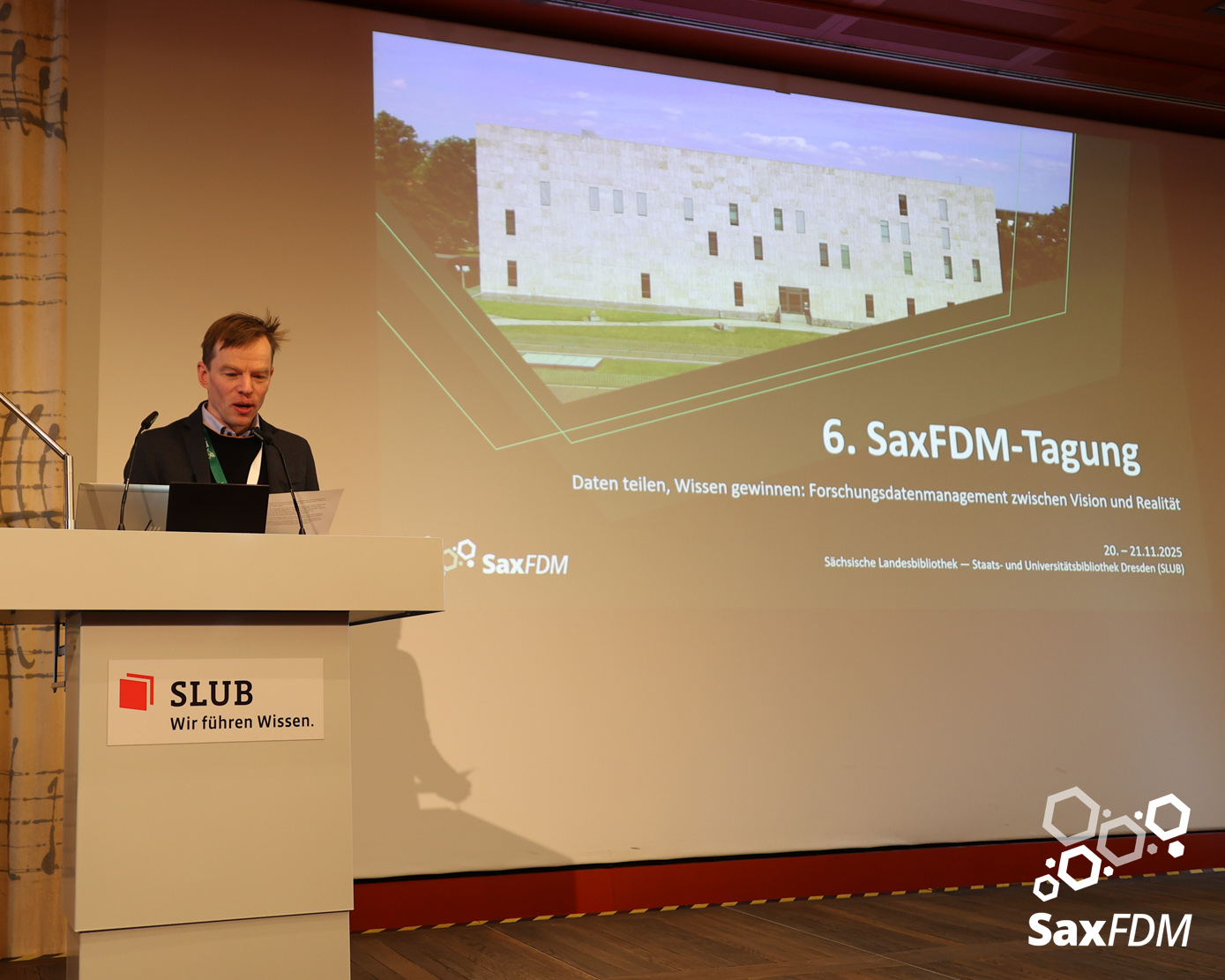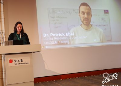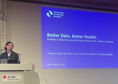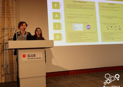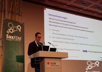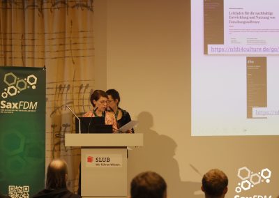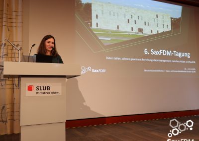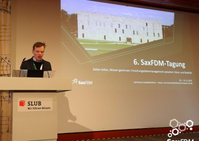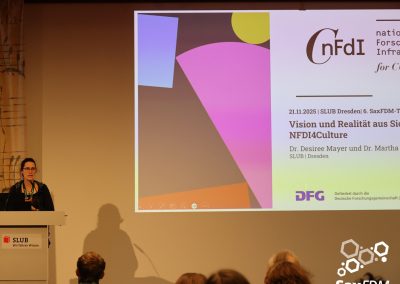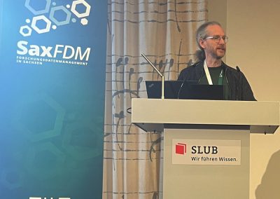 Auf der diesjährigen SaxFDM-Tagung an der Sächsischen Landesbibliothek – Staats- und Universitätsbibliothek (SLUB) in Dresden mit dem Thema „Daten teilen, Wissen gewinnen: Forschungsdatenmanagement zwischen Vision und Realität“ machten wir einerseits eine Art Bestandsaufnahme. Neben Lessons learned und Erfahrungsberichten wurden auch neue Ansätze mit KI und für Berufsrollen in den Impulsvorträgen beleuchtet. Weiter widmeten wir uns auch im Rahmen der Podiumsdiskussion zum Ende des ersten Tages dem Spannungsfeld „Vision und Realität“. Insgesamt acht Workshops und zahlreiche Poster ergänzten die Wortbeiträge und zeigten das vielfältige thematische Spektrum rund um FDM und Open Science. Die Verleihung des diesjährigen SaxFDM Open Data Awards war auch in diesem Jahr das abschließende Highlight zweier inspirierender, anregender und produktiver Tage.