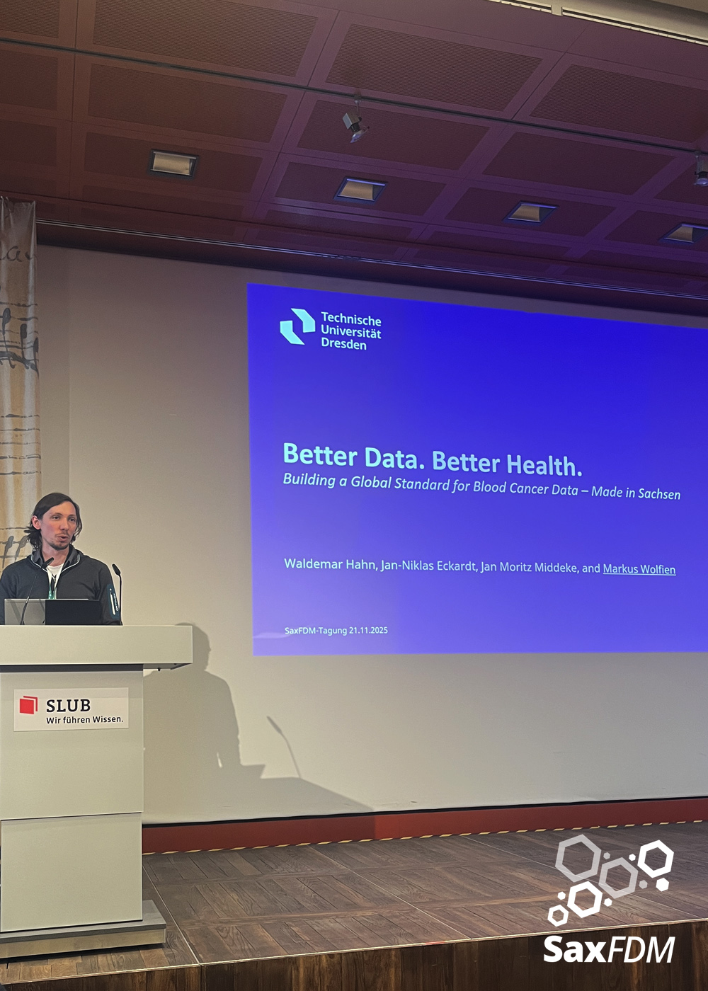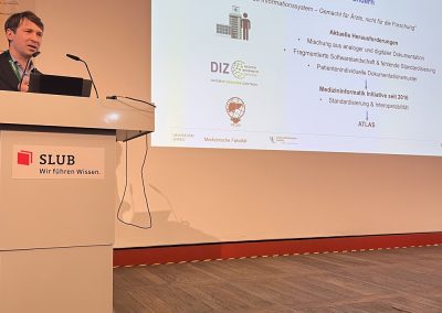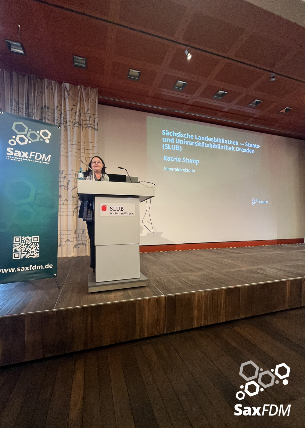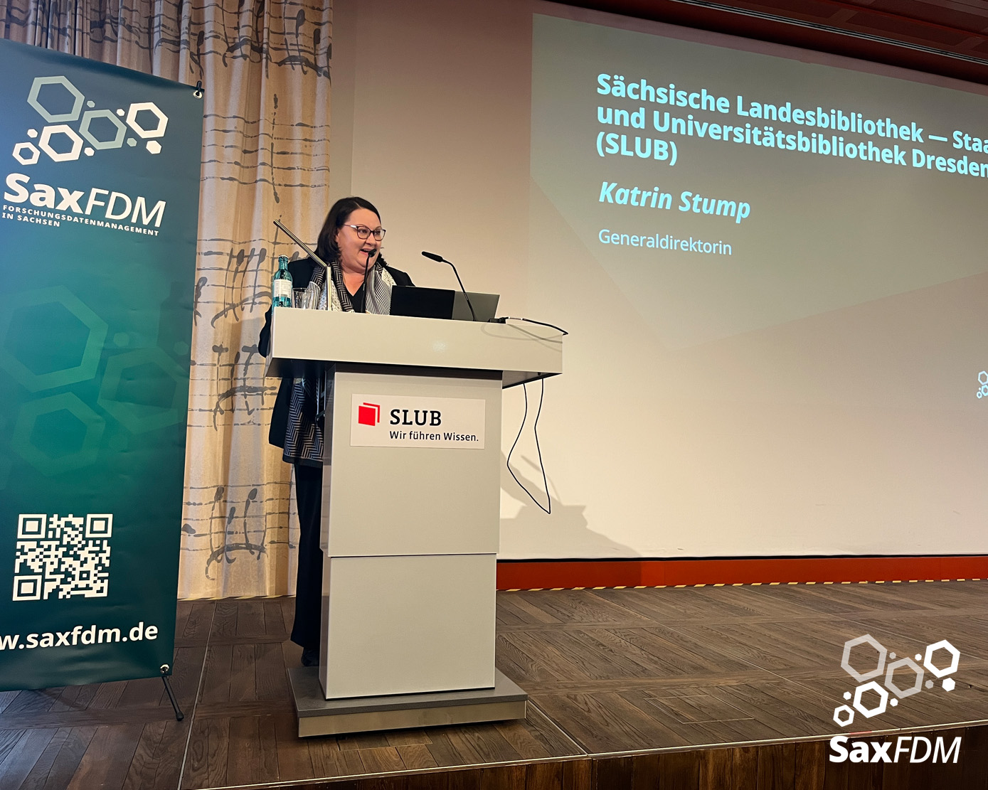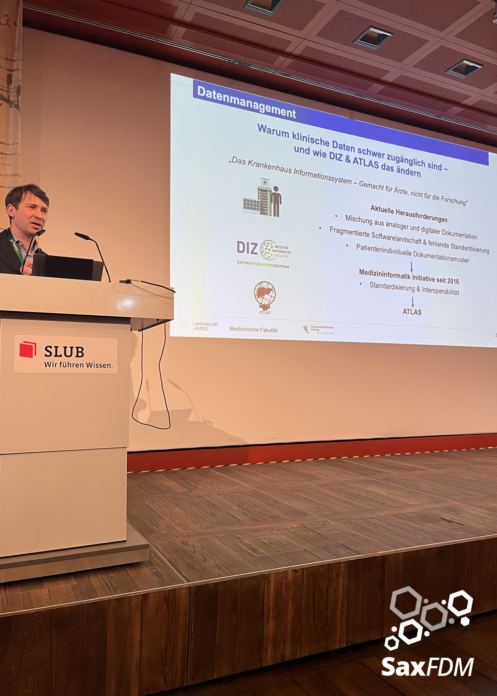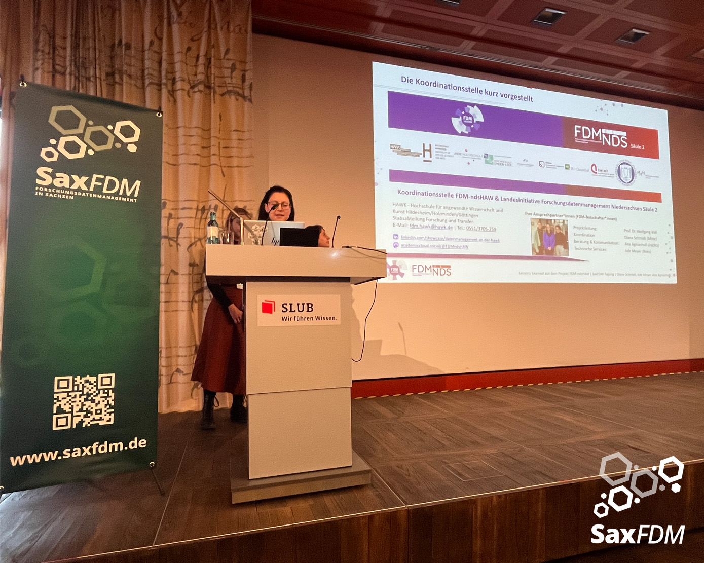 Auf der diesjährigen SaxFDM-Tagung an der Sächsischen Landesbibliothek – Staats- und Universitätsbibliothek (SLUB) in Dresden mit dem Thema „Daten teilen, Wissen gewinnen: Forschungsdatenmanagement zwischen Vision und Realität“ machten wir einerseits eine Art Bestandsaufnahme. Neben Lessons learned und Erfahrungsberichten wurden auch neue Ansätze mit KI und für Berufsrollen in den Impulsvorträgen beleuchtet. Weiter widmeten wir uns auch im Rahmen der Podiumsdiskussion zum Ende des ersten Tages dem Spannungsfeld „Vision und Realität“. Insgesamt acht Workshops und zahlreiche Poster ergänzten die Wortbeiträge und zeigten das vielfältige thematische Spektrum rund um FDM und Open Science. Die Verleihung des diesjährigen SaxFDM Open Data Awards war auch in diesem Jahr das abschließende Highlight zweier inspirierender, anregender und produktiver Tage.
