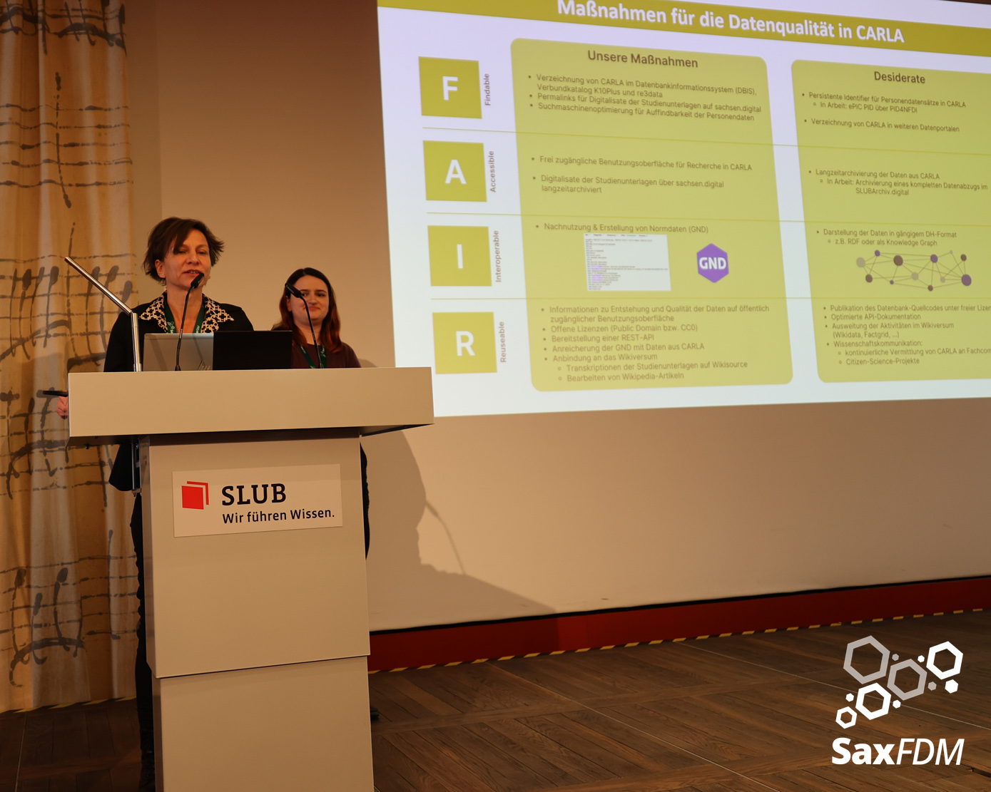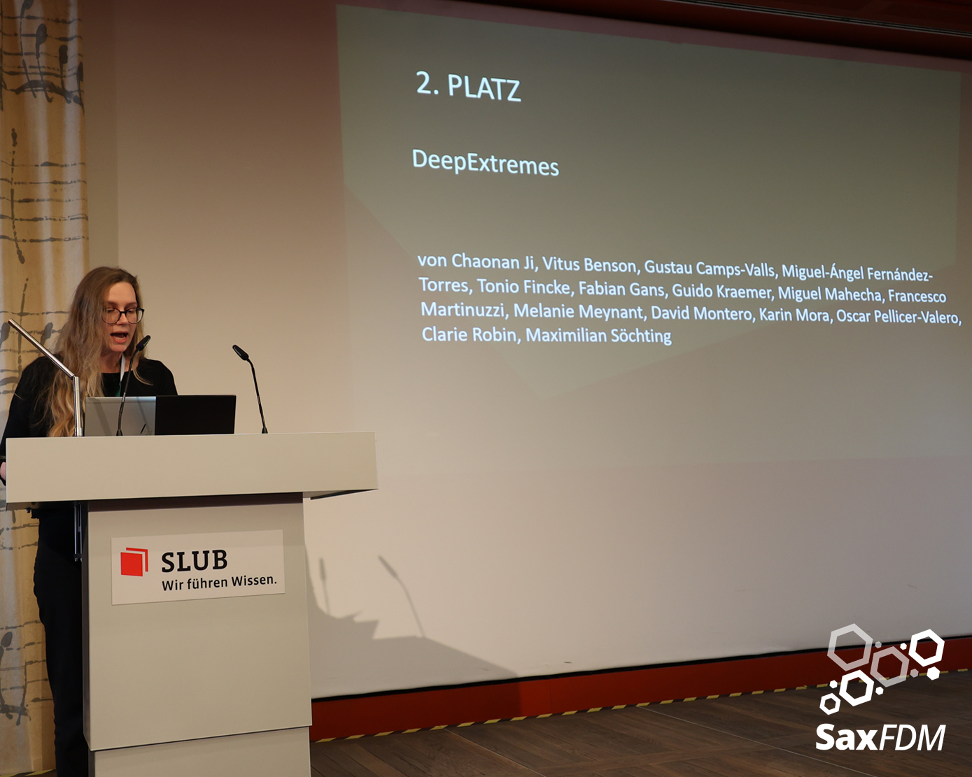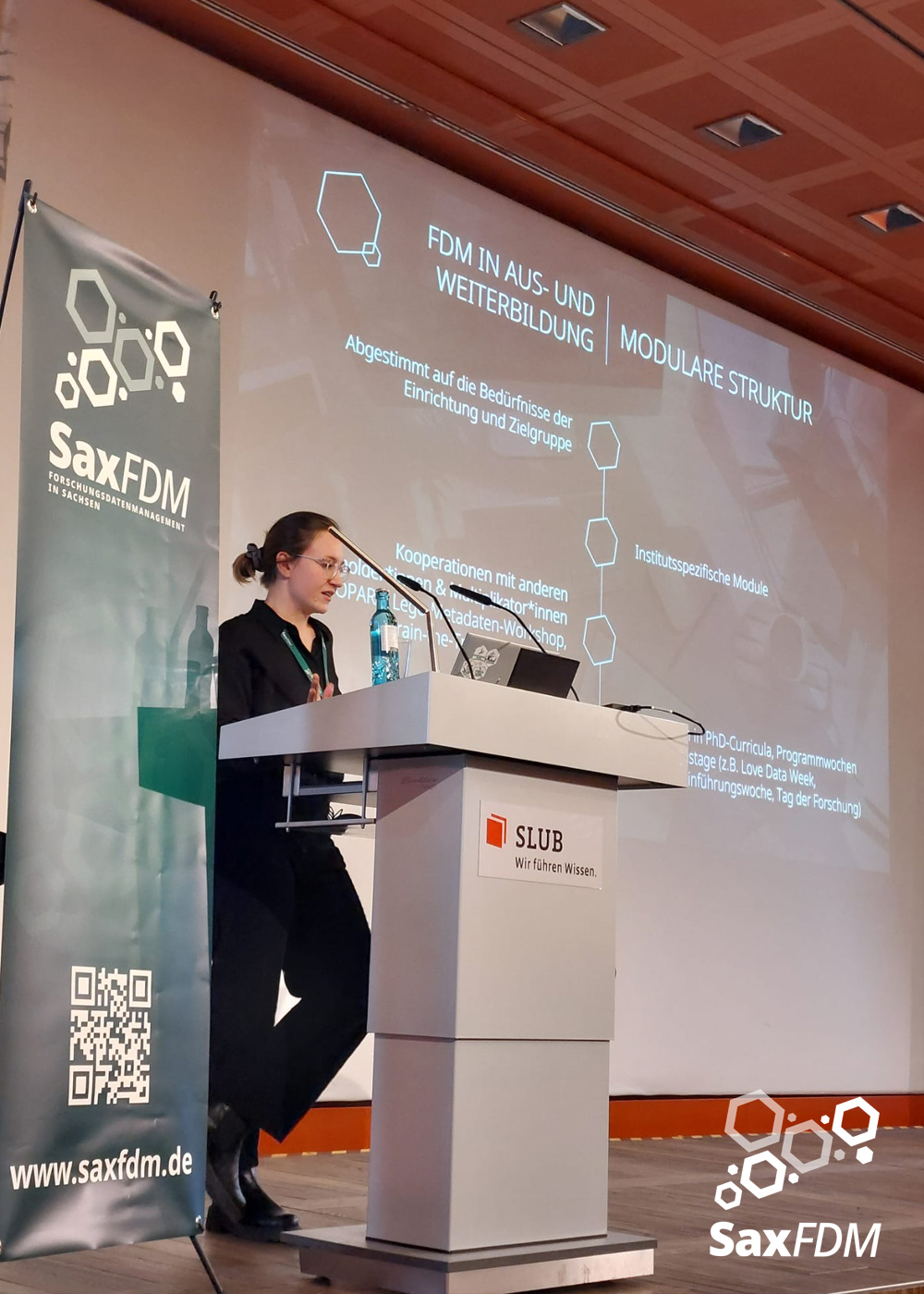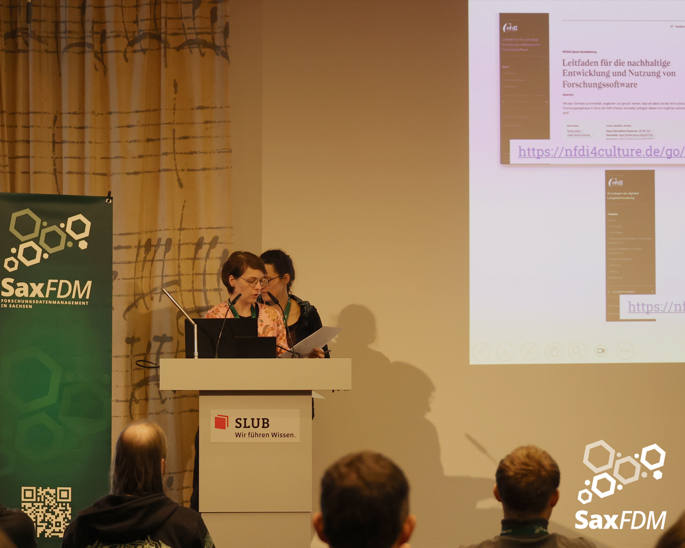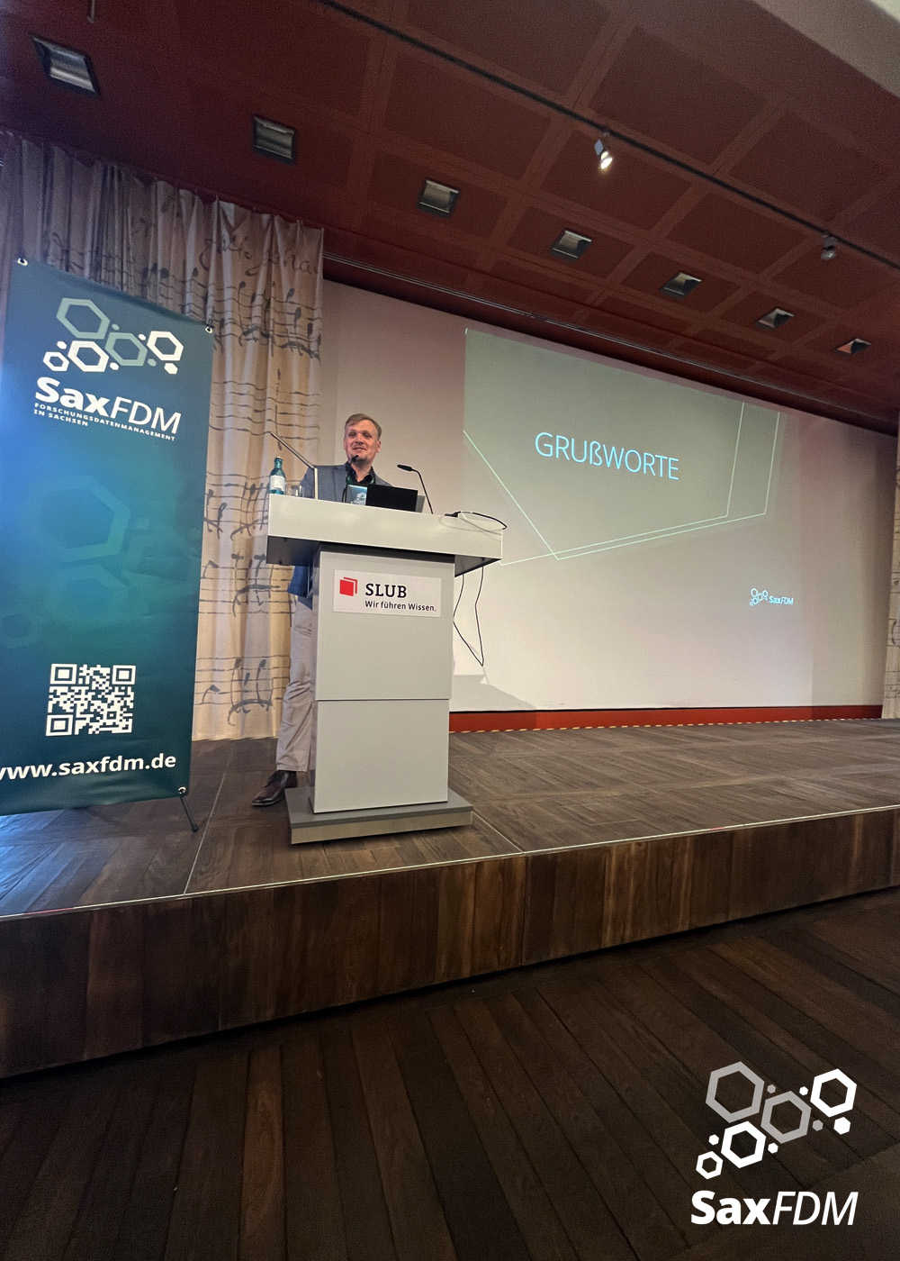 Auf der diesjährigen SaxFDM-Tagung an der Sächsischen Landesbibliothek – Staats- und Universitätsbibliothek (SLUB) in Dresden mit dem Thema „Daten teilen, Wissen gewinnen: Forschungsdatenmanagement zwischen Vision und Realität“ machten wir einerseits eine Art Bestandsaufnahme. Neben Lessons learned und Erfahrungsberichten wurden auch neue Ansätze mit KI und für Berufsrollen in den Impulsvorträgen beleuchtet. Weiter widmeten wir uns auch im Rahmen der Podiumsdiskussion zum Ende des ersten Tages dem Spannungsfeld „Vision und Realität“. Insgesamt acht Workshops und zahlreiche Poster ergänzten die Wortbeiträge und zeigten das vielfältige thematische Spektrum rund um FDM und Open Science. Die Verleihung des diesjährigen SaxFDM Open Data Awards war auch in diesem Jahr das abschließende Highlight zweier inspirierender, anregender und produktiver Tage.