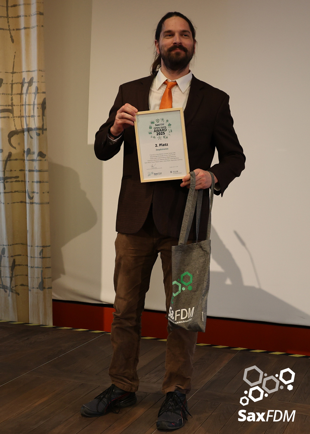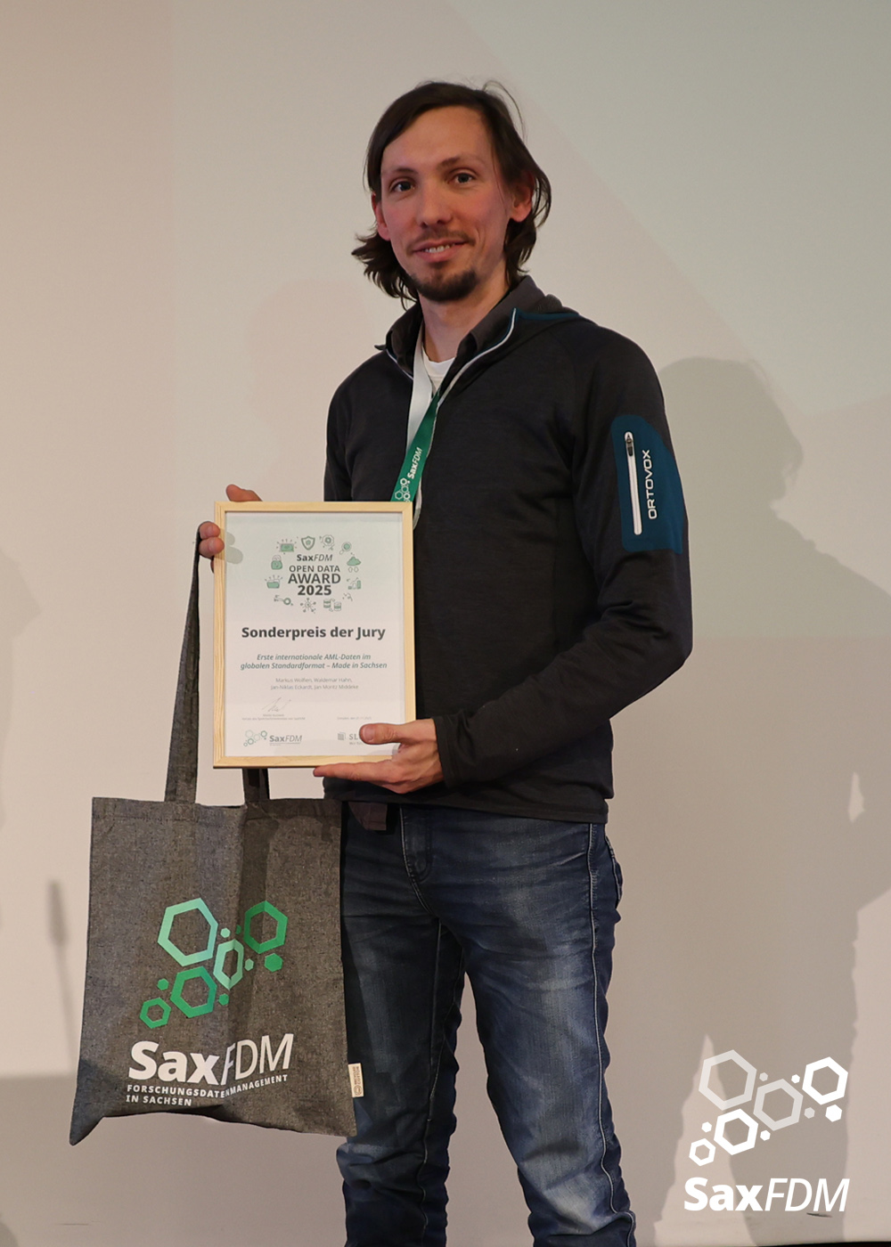 SaxFDM unterstützt und fördert den guten Umgang mit Forschungsdaten auf vielfältige Art und Weise. Die Landesinitiative honoriert auch in diesem Jahr die Anstrengungen in diesem Bereich und hat im Rahmen der Jahrestagung zum dritten Mal feierlich den Award für vorbildhafte Ansätze im Bereich offener Forschungsdaten vergeben. Es waren Einreichungen möglich, die an einer sächsischen Forschungs- oder Kultureinrichtung entstanden sind und für welche die einreichende Person als Angehörige:r der Einrichtung mitverantwortlich zeichnet. Bewertet wurden alle Einreichungen, die zum Zeitpunkt der Teilnahme frei zugänglich und nicht älter als fünf Jahre waren. Eine von SaxFDM gebildete Jury bewertete alle eingegangenen Datensätze unter Berücksichtigung der FAIR-Prinzipien und der einschlägigen Kriterien für Open Data.